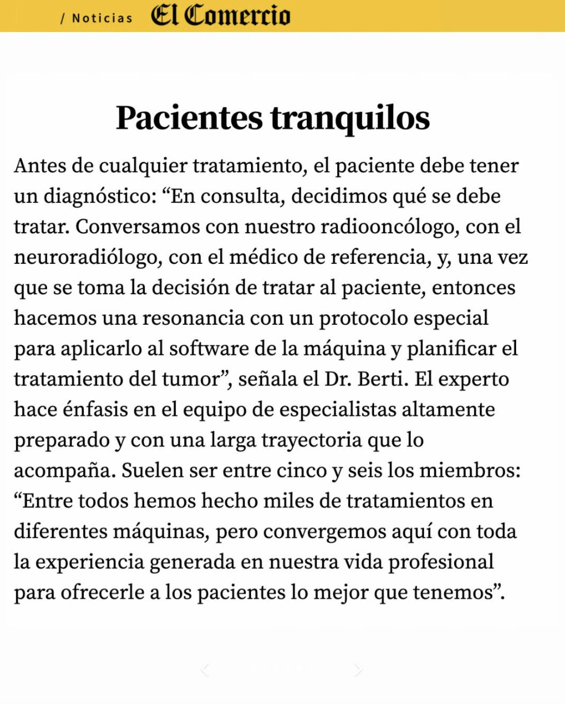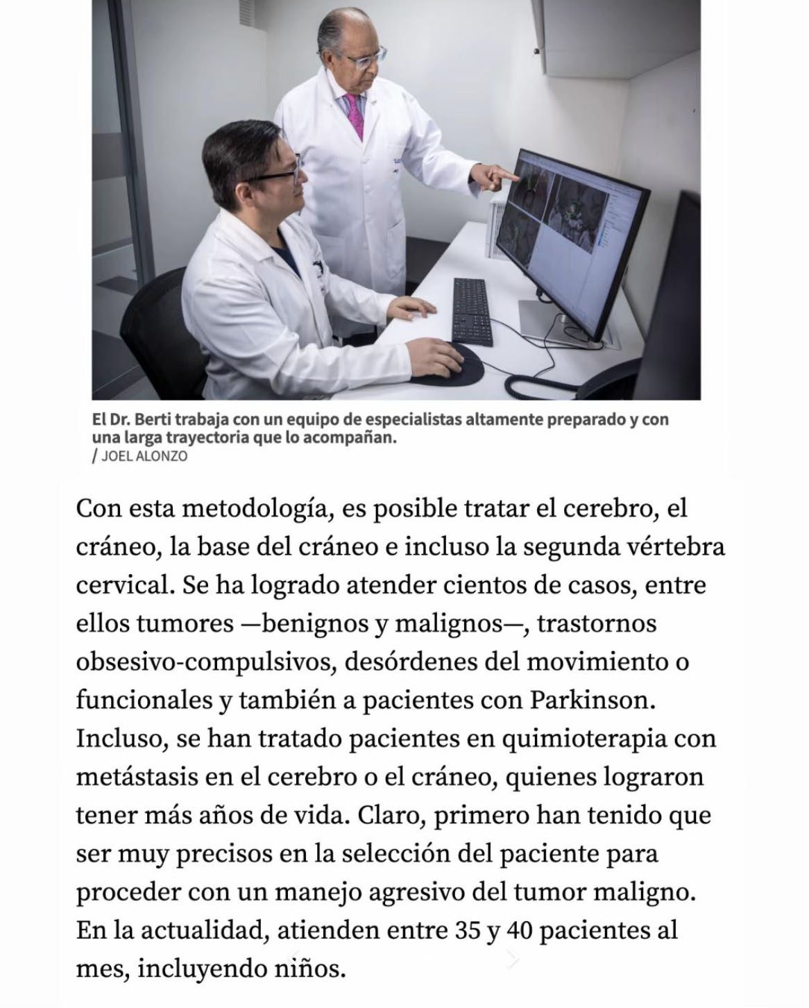 «Está completamente automatizado. Dentro de sí, trae un tomógrafo que puede tomar las tomografías para verificar la precisión del tratamiento y la posición del paciente dentro de la máquina. No interviene la mano del hombre en el cálculo de ningún tipo de coordenadas» – Dr. Aldo Berti
